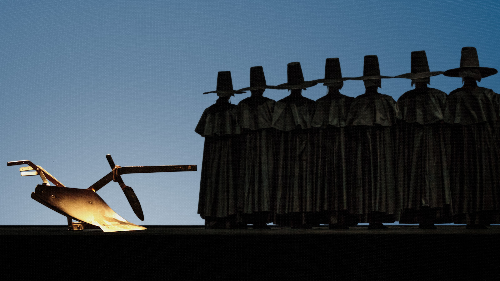 Attraverso l’invenzione di questo nucleo drammatico, Romeo Castellucci penetra e incide, con una intuizione potente, le pagine scritte nel 1835 dal giovane aristocratico francese Alexis de Tocqueville dopo il lungo viaggio negli Stati Uniti d’America. Lo spettacolo affonda nelle pieghe di questo testo, facendo perno nel punto in cui il potenziale del nuovo modello di democrazia rappresentativa si incardina nelle pratiche di vita, nella concezione della terra, nella coscienza collettiva delle colonie fondate da comunità puritane emigrate per scelta dalla vecchia Europa con la volontà di gettare le basi di una fattiva uguaglianza di stampo biblico tra gli esseri umani. “Il nesso tra la matrice puritana e la fondazione della neonata istituzione politica americana è l’occasione per volgersi, con sguardo non conciliato, al dilemma dell’affrancamento dalla legge come apprendimento della libertà, alla manipolazione delle coscienze, alla forza muscolare dell’individualismo, al ruolo delle scelte del singolo per il contratto sociale che definisce diritti e regole della vita collettiva, senza che questi temi diventino mai discorsi diretti sulla democrazia. L’antico modello ateniese è qui solo un posticcio fregio di cartapesta, e la storia americana una sequenza didascalica di fatti e date che recano con sé una eco cruenta. Danze arcaiche e corali, il baratto di una bambina in una distesa palustre, un sabba che convoca la violenta strategia di controllo della caccia alle streghe, inquadrano vedute profonde, lontane, atmosferiche”.