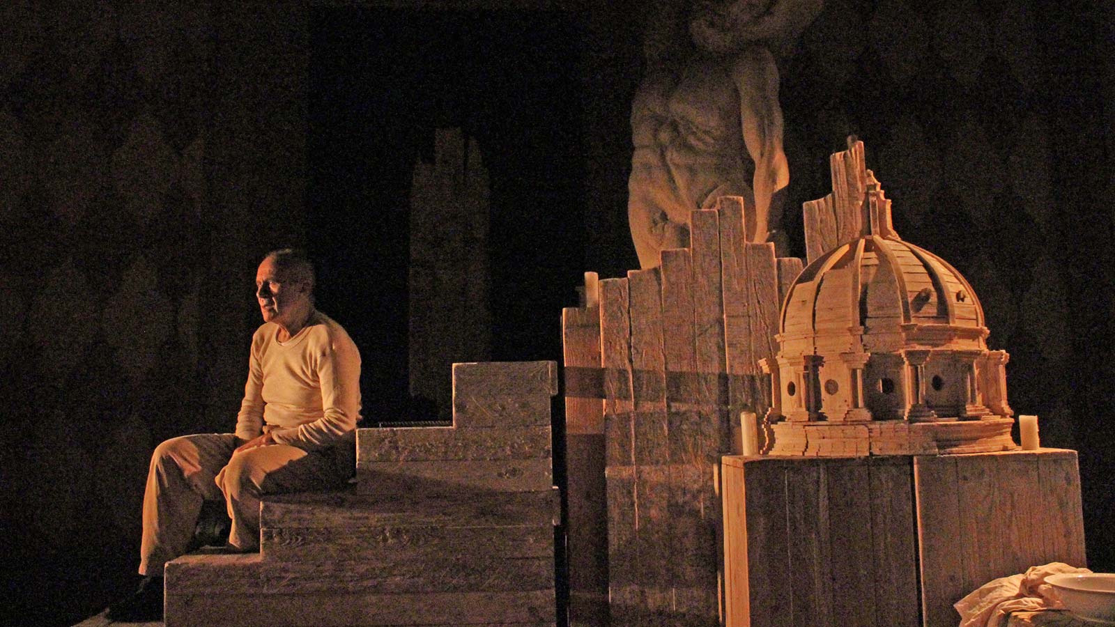 “Michelangelo, un’ossessione che mi insegue da quarant’anni – racconta Antonio Piovanelli – un amore e una passione per la sua incredibile opera e per tutto quello che ci ha lasciato. Avevo poco più di trent’anni quando scoprii anche la sua poesia e le sue lettere, e tanto mi entusiasmarono che decisi di farne un monologo. Il mio sogno era quello di fare uno spettacolo povero da portare in qualsiasi ambito – scuola, Case del Popolo, gallerie d’arte, cantine – alla portata di tutti. E lì, in quei molti luoghi, l’attore solo col suo corpo e la parola, fogli di carta e candele. Adattando le Rime e le Lettere, specialmente quelle indirizzate a Tomaso de’ Cavalieri, il giovane che Michelangelo amò e che era presente alla sua morte, cercai di far emergere l’uomo. Ci sono i rapporti con la famiglia che furono una lotta continua di amore e odio, ci sono la vecchiaia e il carico dell’esperienza, ci sono squarci di vita illuminanti e un finale che, negli ultimi versi, è molto toccante. Ci misi dentro un po’ della mia vita in questo personaggio. Presentai il lavoro a un gruppo di amici romani, interessati al progetto; poi partii per il Sud. Partii povero e tornai dopo tre mesi ricco di calore umano raccolto tra il pubblico; dopo dieci anni ne allestii una seconda edizione in vari teatri e regioni d’Italia, poi all’estero”.