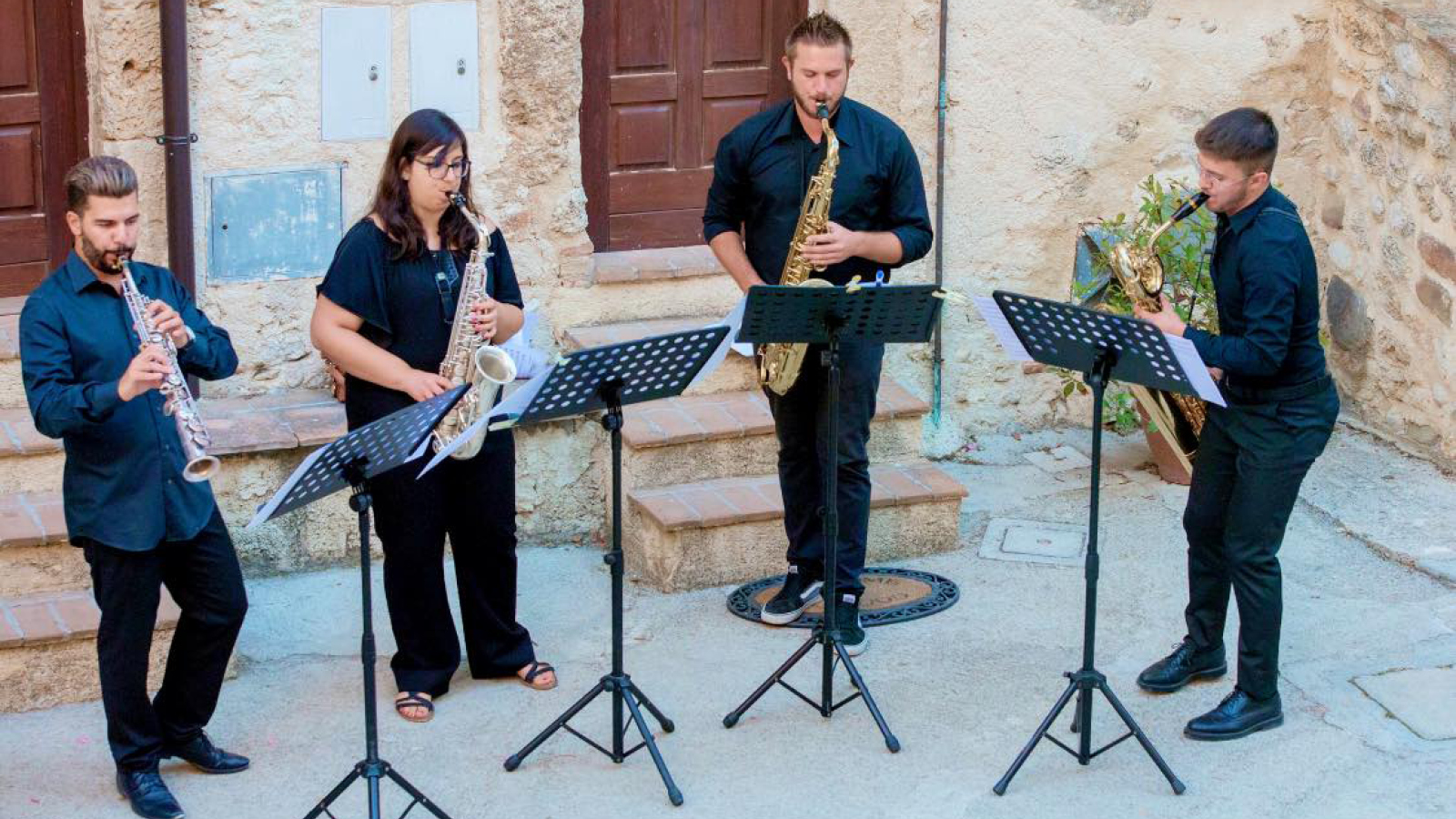 Nei successivi sabati del 18 e 25 luglio, Phoinikes Sax Quartet ci accompagna in un viaggio tra cinema e jazz, a partire dalle grandi colonne sonore di Nino Rota con un omaggio a Fellini, in occasione del centenario dalla nascita, in una originale versione per quartetto di sassofoni di Amarcord, La strada, La dolce vita e 8 ½; per proseguire con l’universo musicale di Gershwin, Girotto e Iturralde. Phoinikes Sax Quartet è un gruppo formato da quattro sassofonisti: Matteo di Giuliani al sax soprano, Luigina Battisti al sax contralto, Danilo Coltella al sax tenore e Luca D’Angeli al sax baritono, diplomati al Conservatorio A. Casella di L’Aquila. Seppur ognuno svolga una fervida attività musicale nazionale e internazionale, a maggio 2019 hanno costituito questo quartetto che divulga il repertorio del sassofono, spaziando fra trascrizioni, brani originali e composizioni moderne frutto delle collaborazioni con giovani compositori. Il loro stile attraversa differenti generi musicali, dal classico alle contaminazioni jazz, dalla musica da film al tango, con l’intenzione di toccare in profondità l’animo degli ascoltatori.