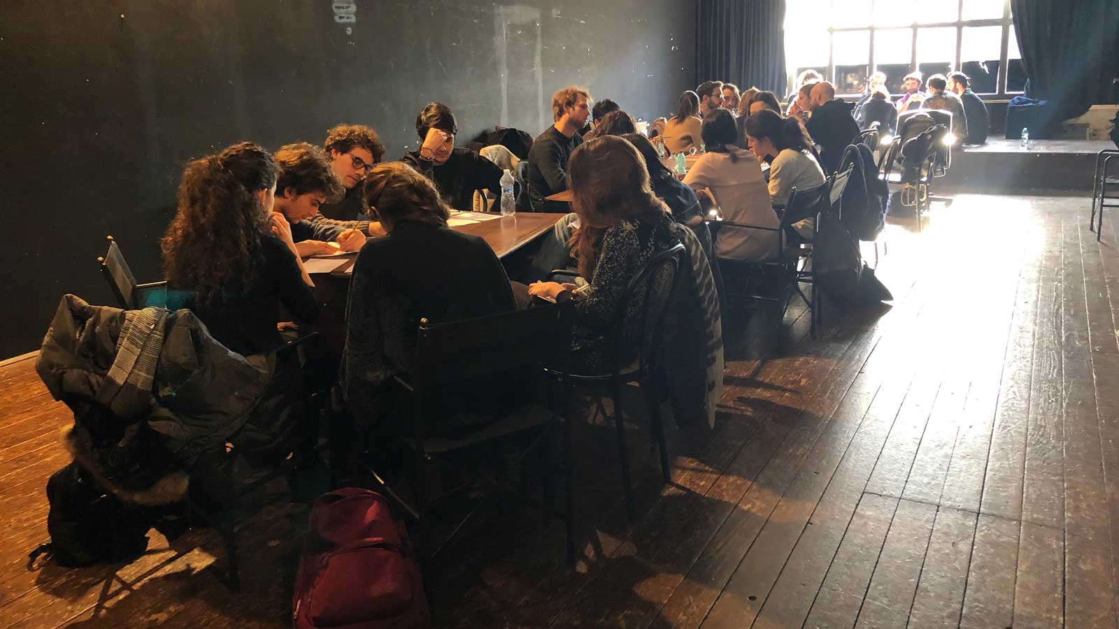 Il lavoro svolto con gli attori della Scuola di Teatro e Perfezionamento Professionale del Teatro di Roma è centrato sulla pratica degli études. Si tratta di scene in improvvisazione psicofisica e verbale che servono a dare corpo a tutto il non scritto che c’è attorno, dietro e sotto il testo dei personaggi. È un approccio che mette fortemente in causa la personalità artistica dell’attore che deve imparare a padroneggiare le migliaia di impulsi che gli arrivano su una scena selezionando quelli utili senza elidere tutta la ricchezza e la vitalità della sua presenza scenica. Una pratica che esclude per sistema la produzione e la ripetizione di segni che abbiano una funzione esclusivamente rappresentativa. Tre sorelle di Cechov pone all’attore, in aggiunta a queste difficoltà, il compito di svolgere tutte le operazioni sceniche in stretta interconnessione con un ensemble di colleghi che raramente è composto da meno di 5 persone contemporaneamente. E ancora esige costante attenzione a tutti gli impulsi dell’ambiente esterno alla scena: rumori, passanti, musiche, disturbi e ovviamente anche pubblico.