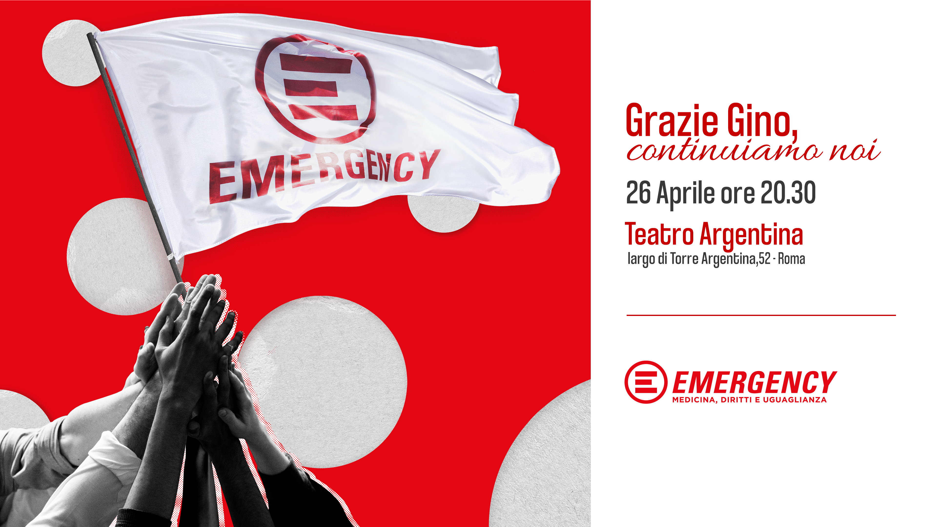 Raccogliere la preziosa eredità lasciata da Gino Strada e trasmettere una cultura di diritti e di pace. Sarà questo il messaggio della serata omaggio “Grazie Gino, continuiamo noi”, organizzata dai volontari di EMERGENCY di Roma martedì 26 aprile alle ore 20.30 al Teatro Argentina.