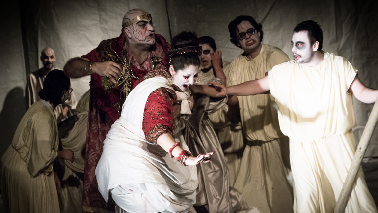 Fra ciò che a tratti appare e ciò che rimane nascosto tra le righe del dramma, tra un guizzo di follia e uno di tremenda passione, la Medea del Teatro Patologico diviene palcoscenico degli impulsi e delle sonorità che non si svelano, nell’ineluttabilità del destino che ogni personaggio si costruisce. Fra le lanterne di un coro che sempiterno ascolta e soccorre, pubblico ed attori palpiteranno in un unico, grande respiro, accompagnando follia ed estasi di morte in un dramma che penetrerà il reale fisico e l’irreale psichico. Gli attori speciali di Dario D’Ambrosi, ragazzi disabili psichici e fisici, rispondono sulla scena ai ritmi delle percussioni e dell’azione tragica, mettendo in relazione corpo e linguaggio: un corpo che si fa lingua attraverso la musica; e un linguaggio che affianca all’italiano il greco antico. Violenza, commozione e dolore, in questa Medea, riverberano nel coro, cuore del dramma accanto a quello della protagonista. Ogni suono completa le vibranti suggestioni del greco antico; mentre l’italiano è lasciato al silenzio, all’assenza di musica, a quella carica di emotività sanguigna che sarà presente nei monologhi di Medea e nei rapidi ed intensi scambi di battute.