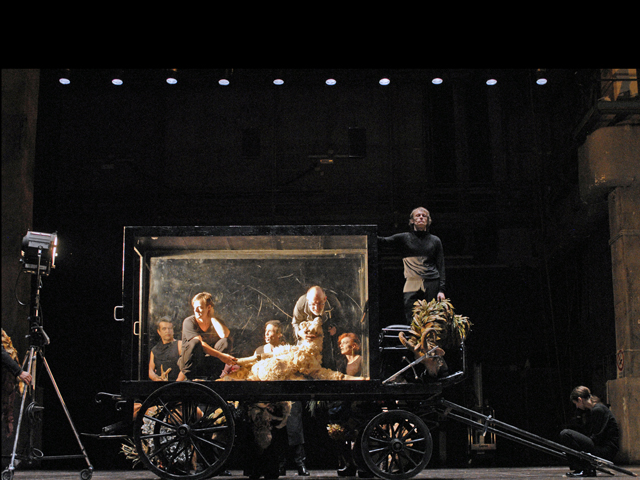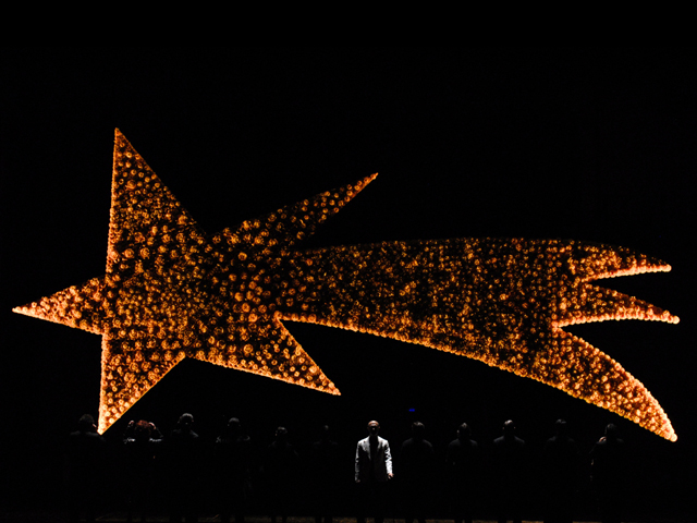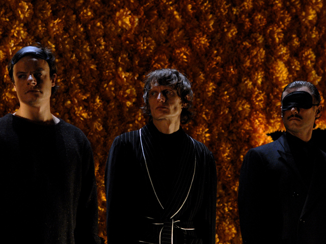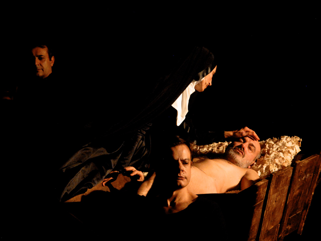 Via di scena l’oggettistica, le ambientazioni, gli interni casalinghi e perfino o’ presepe: restano gli attori e il copione. Perché sì, il testo drammaturgico è rispettato in pieno, fin nella punteggiatura recitata bulimicamente con tanto di chiosa sull’accento da utilizzare. Ma più è fedele la declamazione del testo, maggiore è nei fatti la sua decostruzione a ritmo di cambi musicali: immobile il primo atto, con undici personaggi schierati in proscenio a volto coperto e sovrastati da una gigantesca stella cometa. Roboante il secondo, quello della detonazione, in cui l’istituzione famigliare e il presepe si frantumano a suon di rock, tra lanci di animali di pezza e isterismi domestici. Visionario e immaginifico il terzo, tetro come le nere vesti delle donne conciate a lutto che accerchiano Luca Cupiello nudo al centro della scena in un surreale e caravaggesco presepe di morte e solitudine.