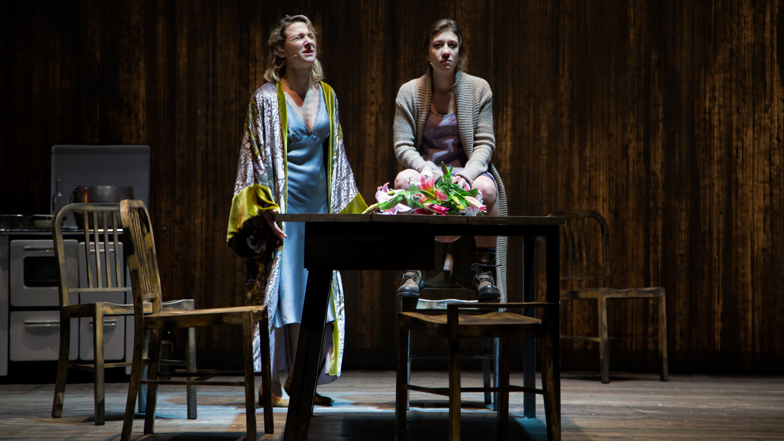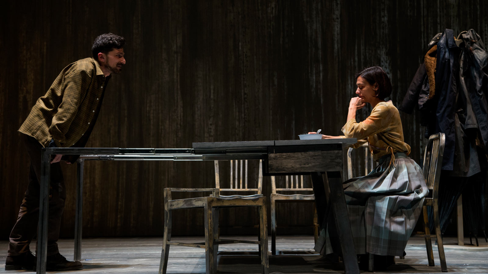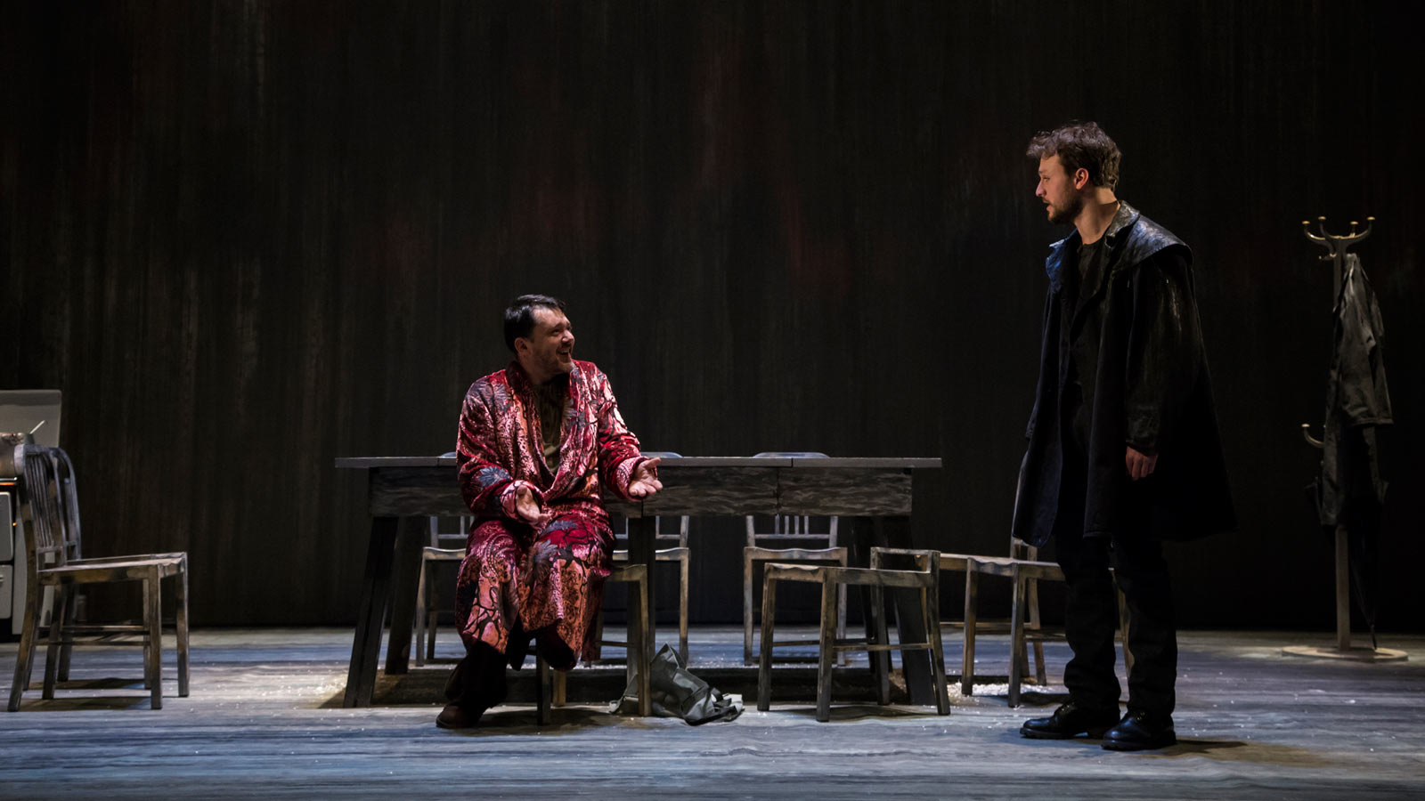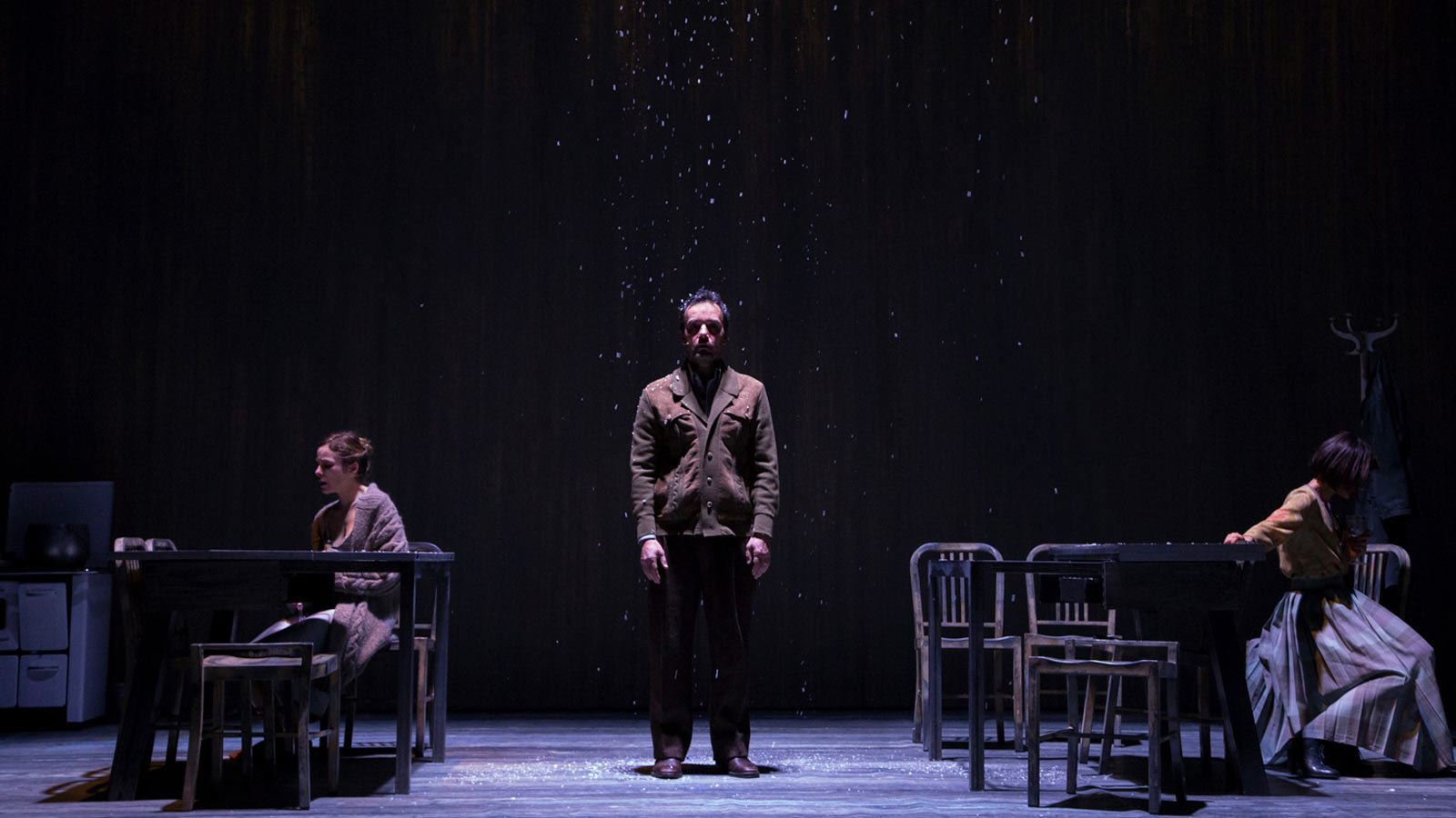 Sta piovendo. Gabriel York aspetta l’arrivo del figlio che non vede da quando questo aveva sette anni: “So cosa vuole. Vuole quello che tutti i giovani vogliono dai loro padri. Vuole sapere chi è. Da dove viene. Dove sia il suo posto. E per quanto ci provi non so cosa dirgli”. È questo l’inizio di una saga familiare, un viaggio “genealogico” nella memoria, le eredità e l’abbandono, che ci porta – avanti e indietro nel tempo, dal 1959 fino al 2039 – alle soglie di un incredibile diluvio torrenziale in cui il passato si materializza in forma di valigia e un pesce caduto dal cielo ha il sapore eccentrico e favoloso della pioggia di rane in Magnolia di Anderson. When the Rain Stops Falling racconta del tempo come sapere e dimenticanza, sapore e leit motiv involontario. Di come il tempo meteorologico influenzi magicamente le nostre vite e cambi la Storia, e di come la Storia stia già cambiando il presente sull’ombra del futuro. Una scenografia minimale – un tavolo e poche sedie – è la condizione per restituire l’asciuttezza incalzante e claustrofobica del testo. Pochi oggetti, qualche ombrello, una valigia, una zuppa di pesce e il grande pesce caduto dal cielo. La proiezione evanescente dello scheletrico albero genealogico ci ricorda che il punto centrale del discorso non è tanto scoprire la “vera storia” di una famiglia, ma è la famiglia stessa. Una sola moltitudine, fatta di reperti incomprensibili, raccolti a un tavolo da pranzo, un lungo tavolo dove si succedono le generazioni.